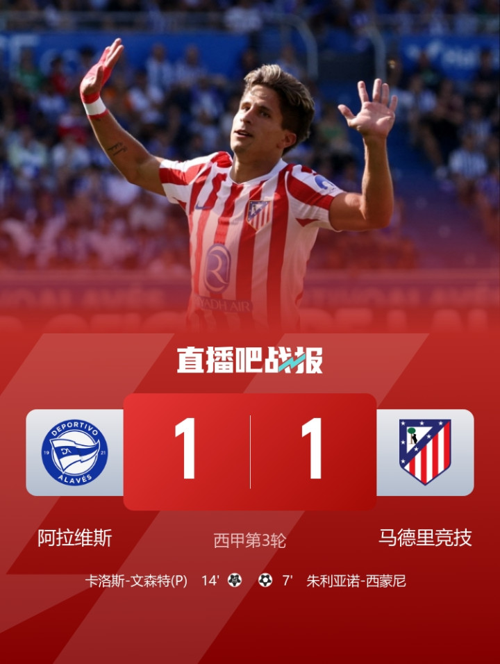 直播吧8月31日讯北京时间8月30日晚23时整,2025-26赛季西甲第3轮在门迪索罗察球场展开角逐,马德里竞技客场对阵阿拉维斯。上半场小西蒙尼斩获赛季首球,索尔洛特送点,文森特点射扳平,下半场格列兹曼替补中柱。最终马竞客场1-1战平阿拉维斯,马竞联赛开局3轮不胜&2平1负仅积2分,下轮将主场迎战比利亚雷亚尔。