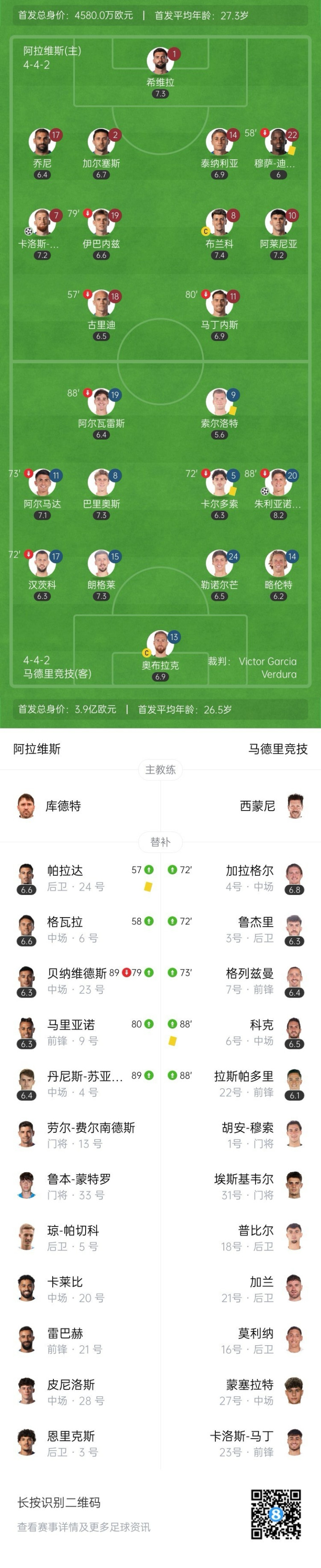 全场比赛结束,马德里竞技客场1-1战平阿拉维斯。
